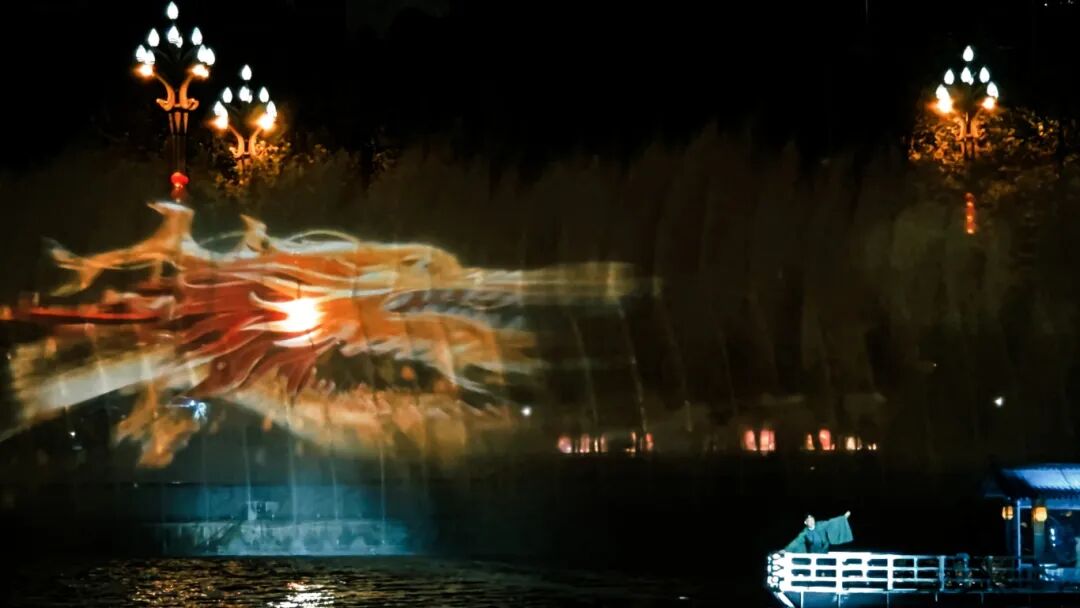 沿途灯火璀璨,岸上光影交织,湖中舞影翩跹,带你沉浸式体验“水上大唐不夜城”!