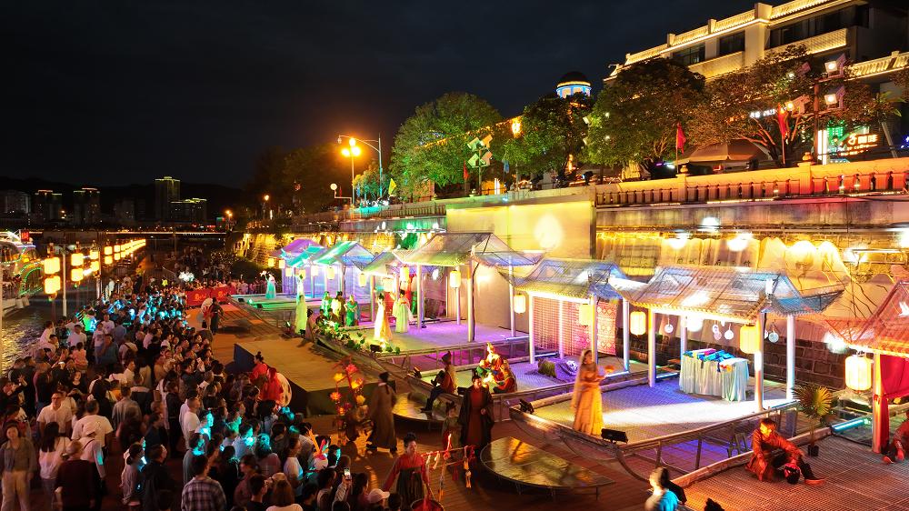 华服摇曳凤羽船上,翩然舞姿再现河湾盛世欢歌;